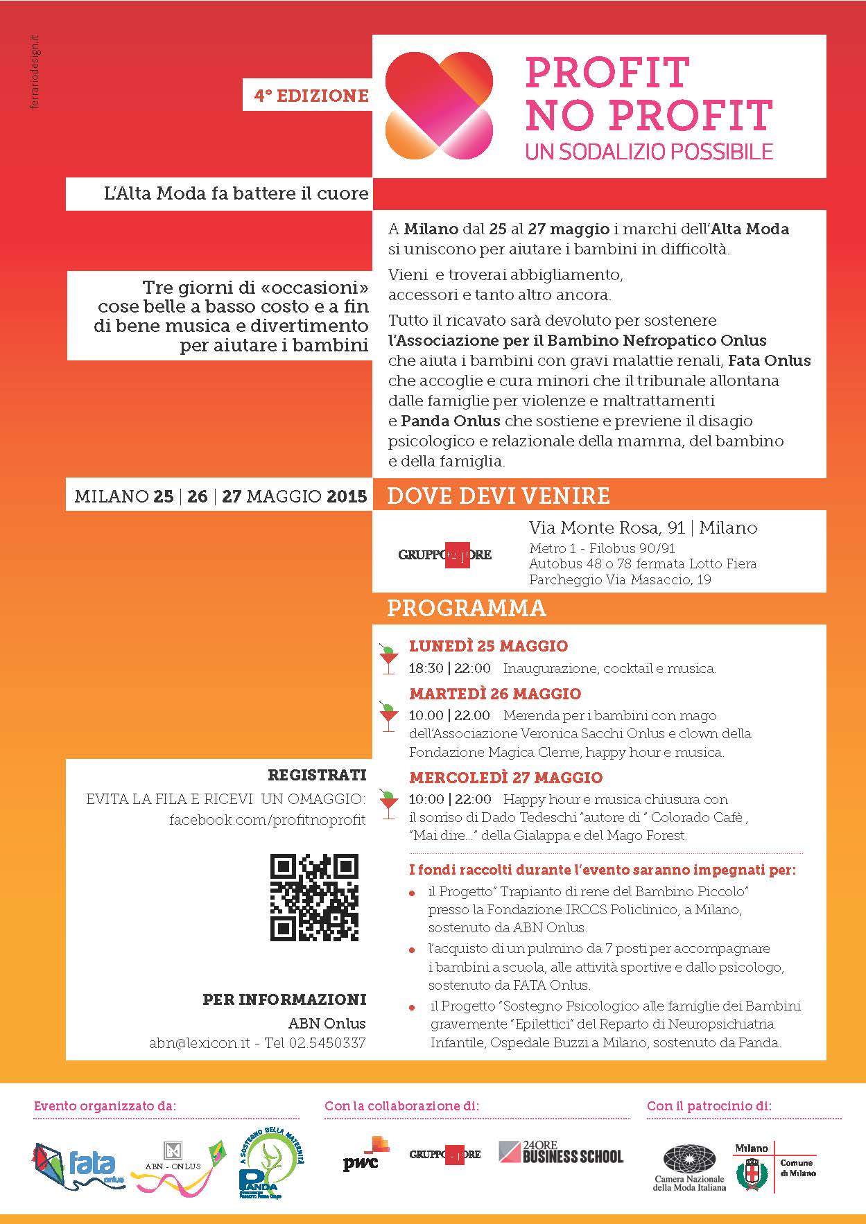 Milano, 4 maggio 2015 – Un grande evento all’insegna della beneficenza tra moda, beauty, food e tanto divertimento per grandi e bambini. L’evento Profit No Profit, giunto con successo alla sua 4° edizione, dal 25 al 27 maggio, aprirà le porte a un grande spazio outlet in Via Monte Rosa 91 a Milano, in cui saranno esposti vestiti, borse, scarpe, giocattoli, cibo, gioielli, biancheria, creme, occhiali e tanti altri prodotti con sconti del 50% sul prezzo di listino. Gli articoli, proposti da più di 60 case di moda, da sempre impegnate in progetti solidali, saranno accessibili a tutte le tasche e ci saranno anche numerosi corner di aziende che offriranno parte del loro ricavato in beneficenza.